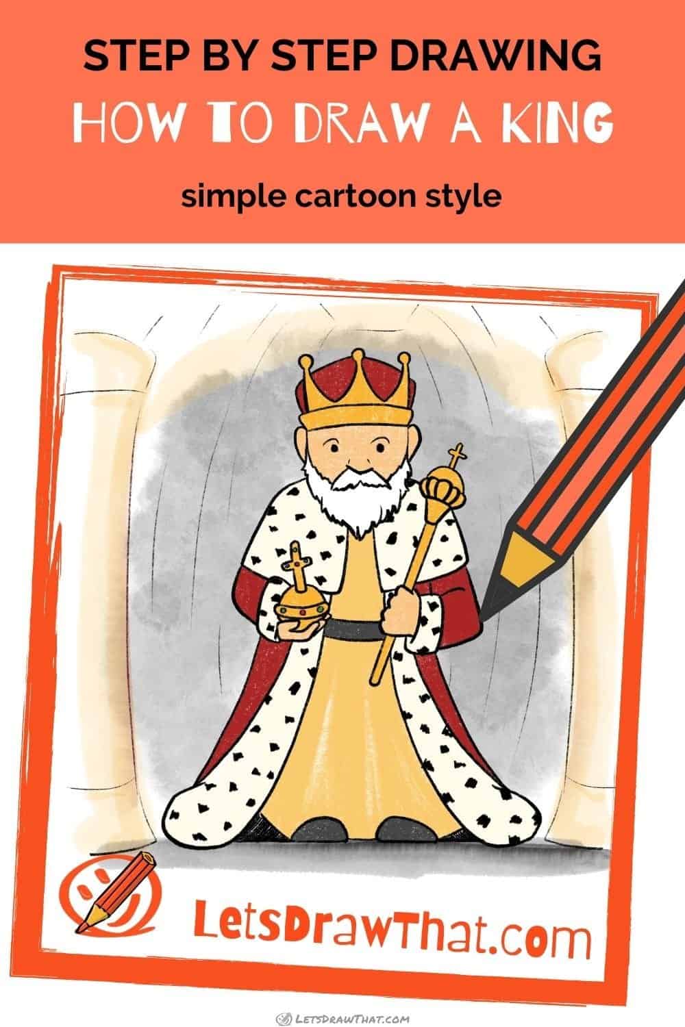 Learn how to draw a king. A step by step, simple way to draw a king in a robe, with a crown and royal regalia. A bonus crash course in Latin names included.